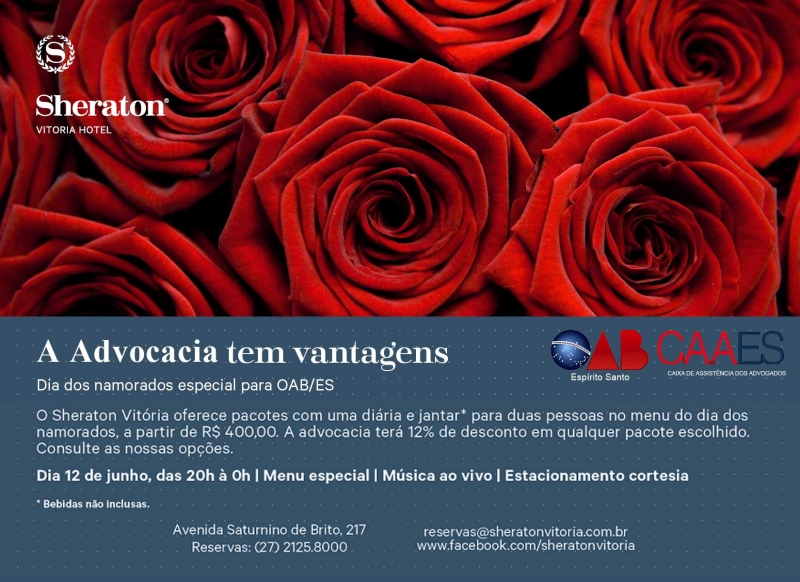 Para a comemoração de Dia dos Namorados a OAB-ES e a CAAES conseguiram manter o desconto especial oferecido à advocacia na parceria com o Sheraton Vitória Hotel.