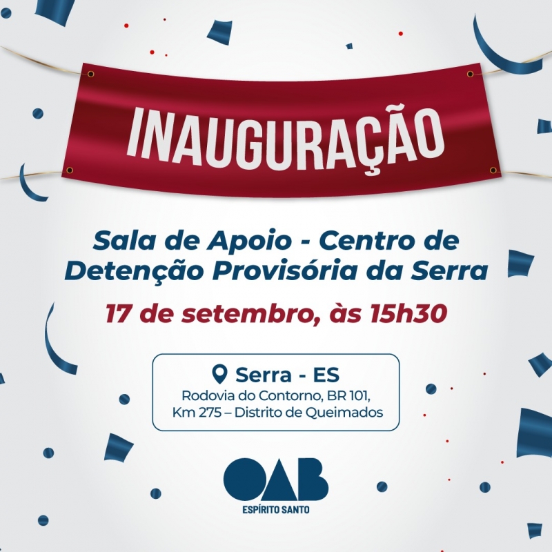 A inauguração, que será nesta sexta-feira (16/09), às 15h30, contará com a presença do presidente da Ordem dos Advogados do Brasil- Seccional Espírito Santo, José Carlos Rizk Filho, e do presidente da 17ª Subseção da Serra, Ítalo Scaramussa Luz.
