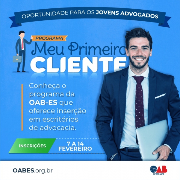 A OAB-ES vai lançar nesta quinta-feira (06/02) o seu mais novo projeto: o programa “Meu primeiro cliente”, com objetivo de incentivar e auxiliar a inserção dos jovens advogados no mercado de trabalho. O lançamento acontece às 17h, no Plenário, na sede da Ordem, em Vitória.
