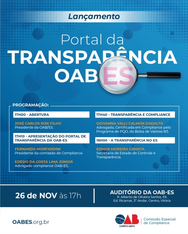 A advocacia e toda a sociedade poderão acompanhar informações sobre as contas e as demonstrações contábeis e financeiras da Ordem dos Advogados do Brasil - Seccional Espírito Santo (OAB-ES) e das suas subseções. Cumprindo o compromisso de ampliar a transparência da atual gestão, a OAB-ES lança, na tarde desta terça-feira (26/11), o seu Portal de Transparência. O lançamento acontece às 17 horas, no auditório da OAB-ES, em Vitória.