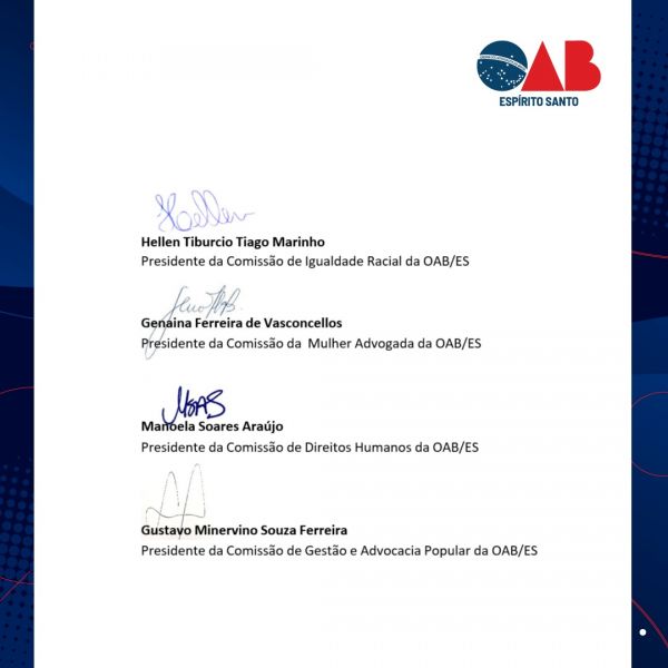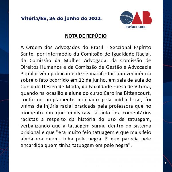 A Ordem dos Advogados do Brasil - Seccional Espírito Santo, por intermédio da Comissão de Igualdade Racial, da Comissão da Mulher Advogada, da Comissão de Direitos Humanos e da Comissão de Gestão e Advocacia Popular vêm publicamente se manifestar com veemência sobre o fato ocorrido em 22 de junho, em sala de aula do Curso de Design de Moda, da Faculdade Faesa de Vitória, quando na ocasião a aluna do curso Carolina Bittencourt, conforme amplamente noticiado pela mídia local, foi vítima de injúria racial praticada pela professora que no momento em que ministrava a aula fez comentários racistas a respeito da história do uso de tatuagem, verbalizando que a tatuagem surgiu dentro do sistema prisional e que "era muito feio tatuagem e que mais feio ainda era quem tinha pele negra. E que parecia pele encardida quem tinha tatuagem em pele negra".