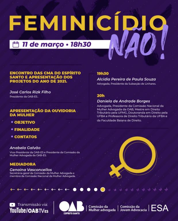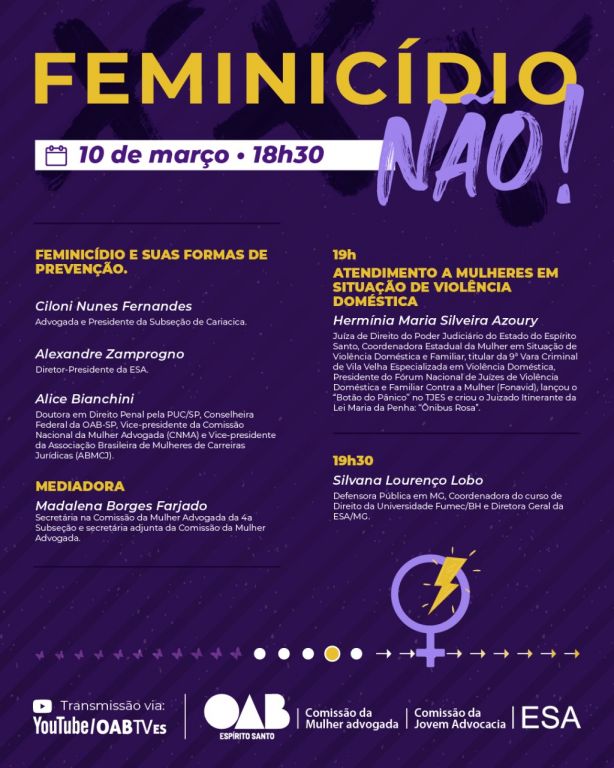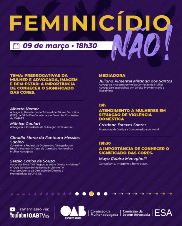 A programação, que contará com várias ações temáticas, inclui um ciclo de debates e palestras online sobre "Feminicídio", que reunirá especialistas renomados e convidadas especiais para falar sobre este tipo específico de crime. O evento acontecerá de 8 a 11 de março de 18h às 19h30 e conta com o apoio da ESA-ES.