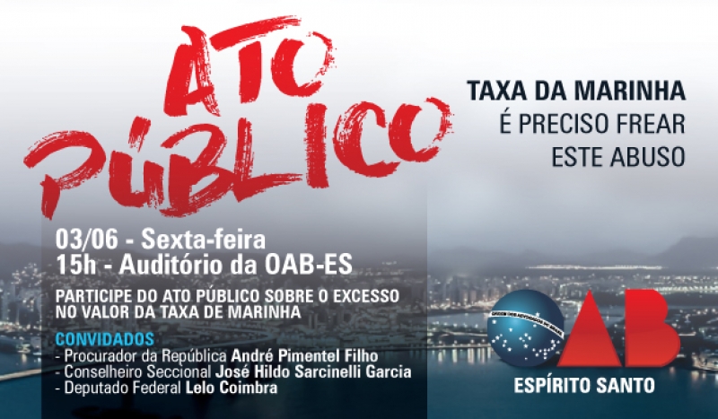 A Taxa de Marinha será o tema do Ato Público nessa sexta-feira (03), na sede da OAB-ES, às 15h. O objetivo é fazer com que a sociedade se envolva com o assunto e obtenha mais informações sobre este abuso. Profissionais da área jurídica e legisladores estarão presentes no evento para esclarecer diversos pontos e contribuir para frear essa taxa que afronta o princípio constitucional da razoabilidade.
