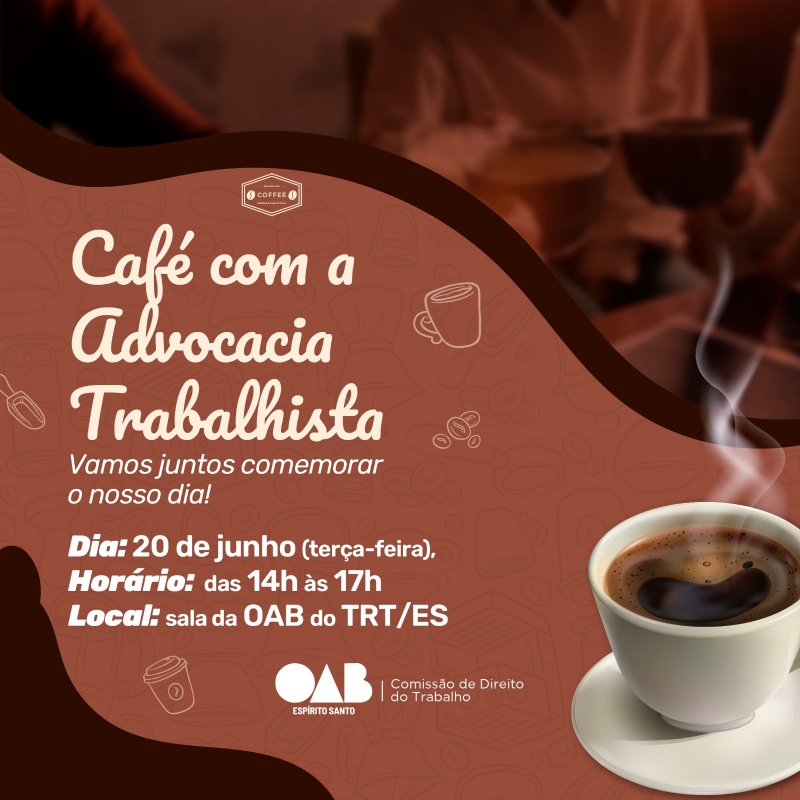 A Ordem dos Advogados do Brasil - Seccional Espírito Santo (OAB-ES) realiza um café da tarde para celebrar o Dia do Advogado e da Advogada Trabalhista nesta terça-feira (20/06).