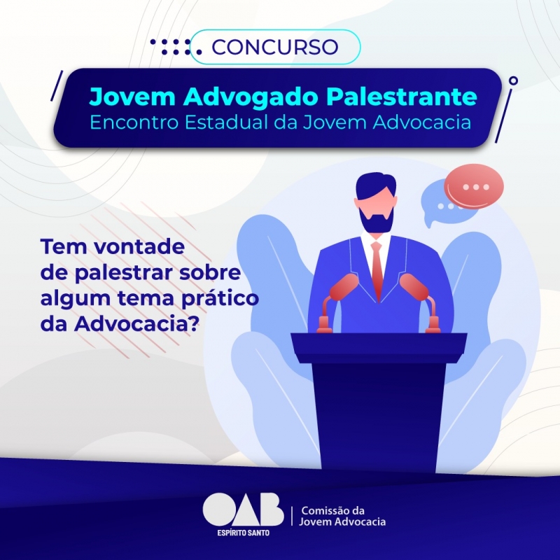 A OAB-ES por meio da Comissão da Jovem Advocacia está promovendo o concurso “Jovem Advogado Palestrante”. O ganhador do concurso terá a oportunidade de apresentar uma palestra no Encontro Estadual da Jovem Advocacia Capixaba que acontece nos próximos dias 26, 27 e 29 de julho.