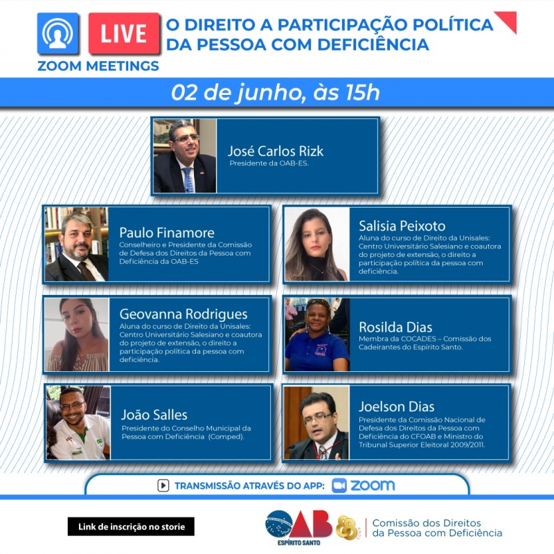 A fim de discutir a importância do tema, a Comissão convida as alunas Geovanna Rodrigues e Salisia Peixoto, autoras do Projeto de Extensão Universitária " o direito à participação política da pessoa com deficiência: sufrágio universal enquanto instrumento de inclusão" para debater o tema e apresentar os principais resultados da prática.