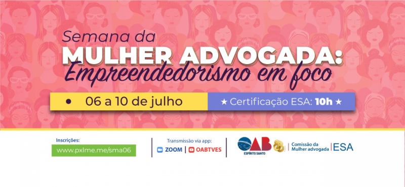 Vem aí a Semana da Mulher Advogada. A Ordem dos Advogados do Brasil - Seccional Espírito Santo (OAB-ES), por meio da Comissão da Mulher Advogada, promove o evento de forma on-line de 6 a 10 de julho.