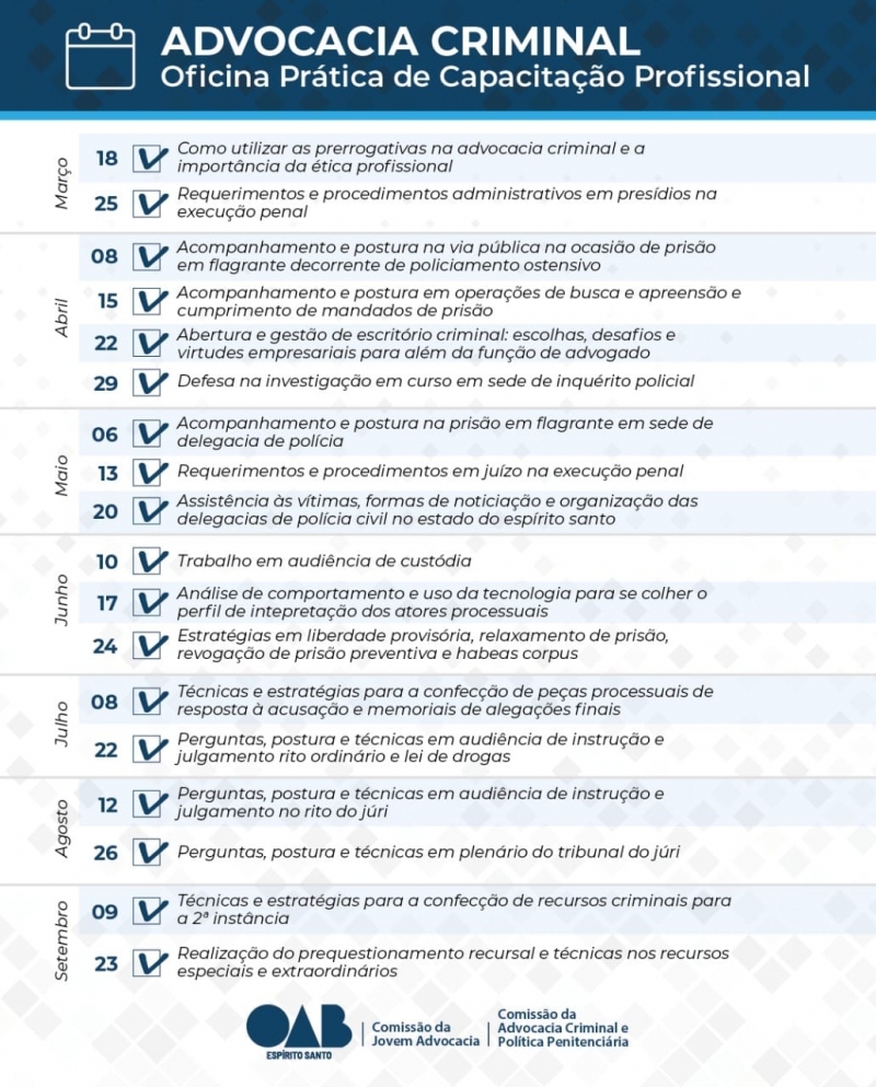 O curso é voltado para toda a advocacia capixaba. Serão 18 encontros que irão acontecer até o mês de setembro e contará com profissionais instrutores de diversas carreiras correlatas aos temas propostos.