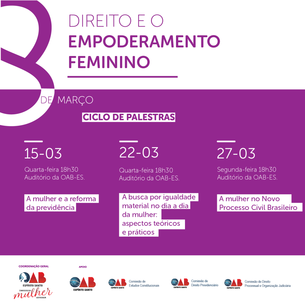 A Ordem dos Advogados do Brasil – Seção Espírito Santo (OAB-ES), com coordenação geral da Comissão da Mulher Advogada, vai realizar entre os dias 15 e 27 deste mês, às 18h30, um ciclo de debates com o tema “Direito e empoderamento feminino”.
