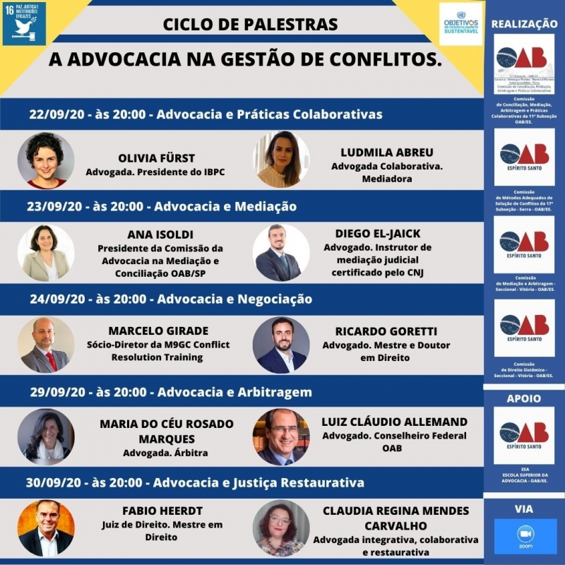A OAB-ES, por meio da Comissão de Mediação e Arbitragem, da Comissão de Direito Sistêmico, da Comissão de Métodos Adequados de Solução de Conflitos da 17a Subseção da Serra e a Comissão de Conciliação, Mediação, Arbitragem e Práticas Colaborativas da 11a Subseção de Cariacica, promove o Ciclo de Palestras on-line "A advocacia na Gestão de Conflitos" nos próximos dias 22, 23, 24, 29 e 30 de setembro, às 20 horas.