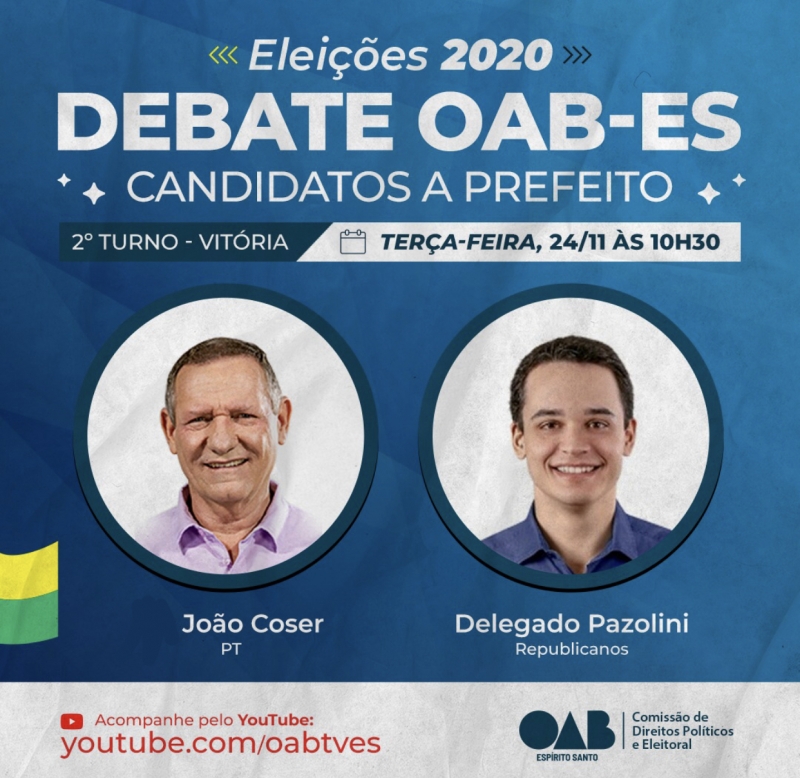 A Ordem dos Advogados do Brasil - Seccional Espírito Santo (OAB-ES) convidou, nesta quinta-feira (19/11), os candidatos à Prefeitura de Vitória para um debate eleitoral na sede da entidade, na terça-feira (24/11), às 10h30. Foram chamados os dois concorrentes ao segundo turno, João Coser (PT) e Lorenzo Pazolini (Republicanos).