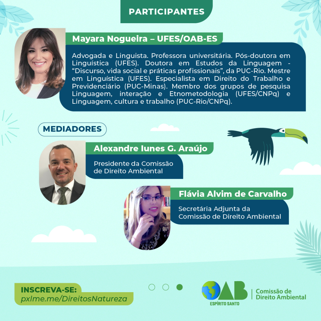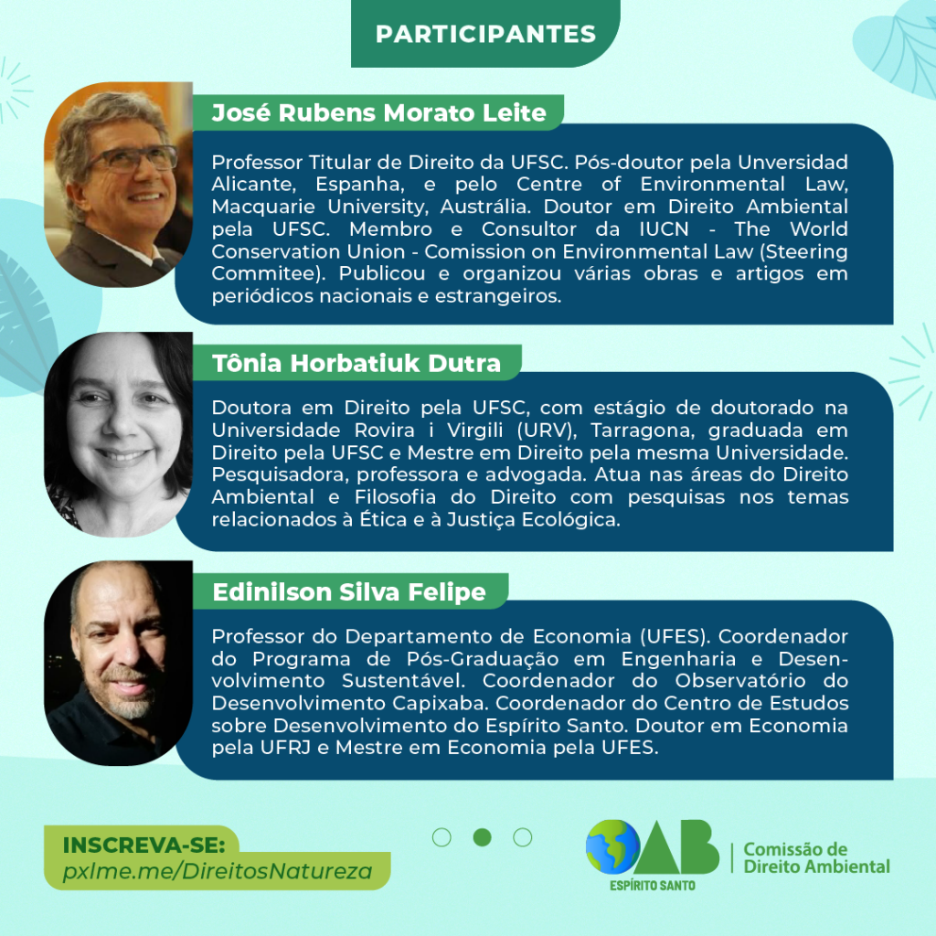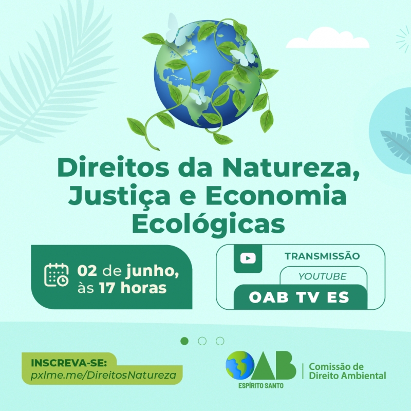 A Ordem dos Advogados do Brasil, Seccional Espírito Santo (OAB-ES), por meio da Comissão de Direito Ambiental, realizará no próximo dia 02 de junho, às 17 horas, de forma on-line, o evento “Direitos da Natureza, Justiça e Economia Ecológicas''.