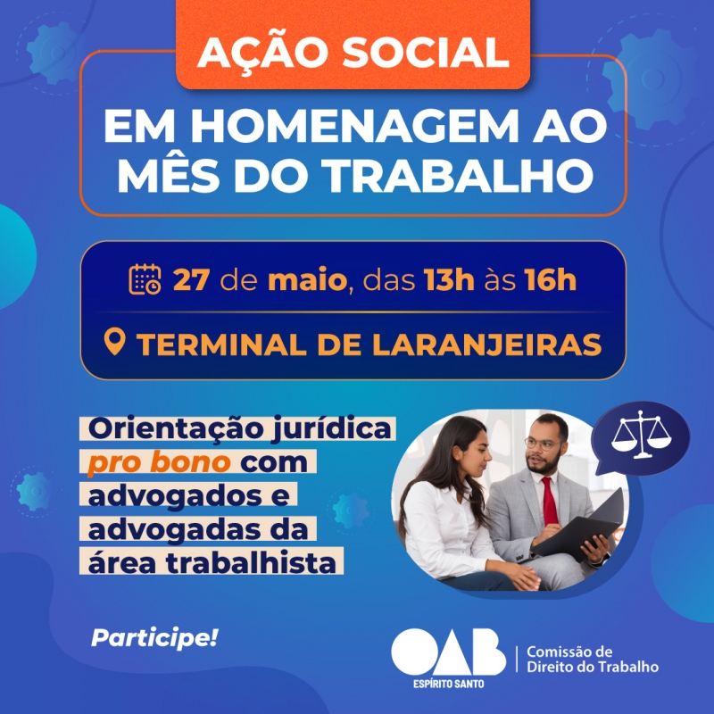 A Ordem dos Advogados do Brasil, Seccional Espírito Santo (OAB-ES), por meio da Comissão de Direito do Trabalho, realizará, em 27 de maio, das 13 às 16 horas, no Terminal Rodoviário de Laranjeiras, na Serra, a ação social “Assistência Jurídica”, em comemoração ao mês do trabalhador. A ação também acontecerá ao longo do mês em outros locais..