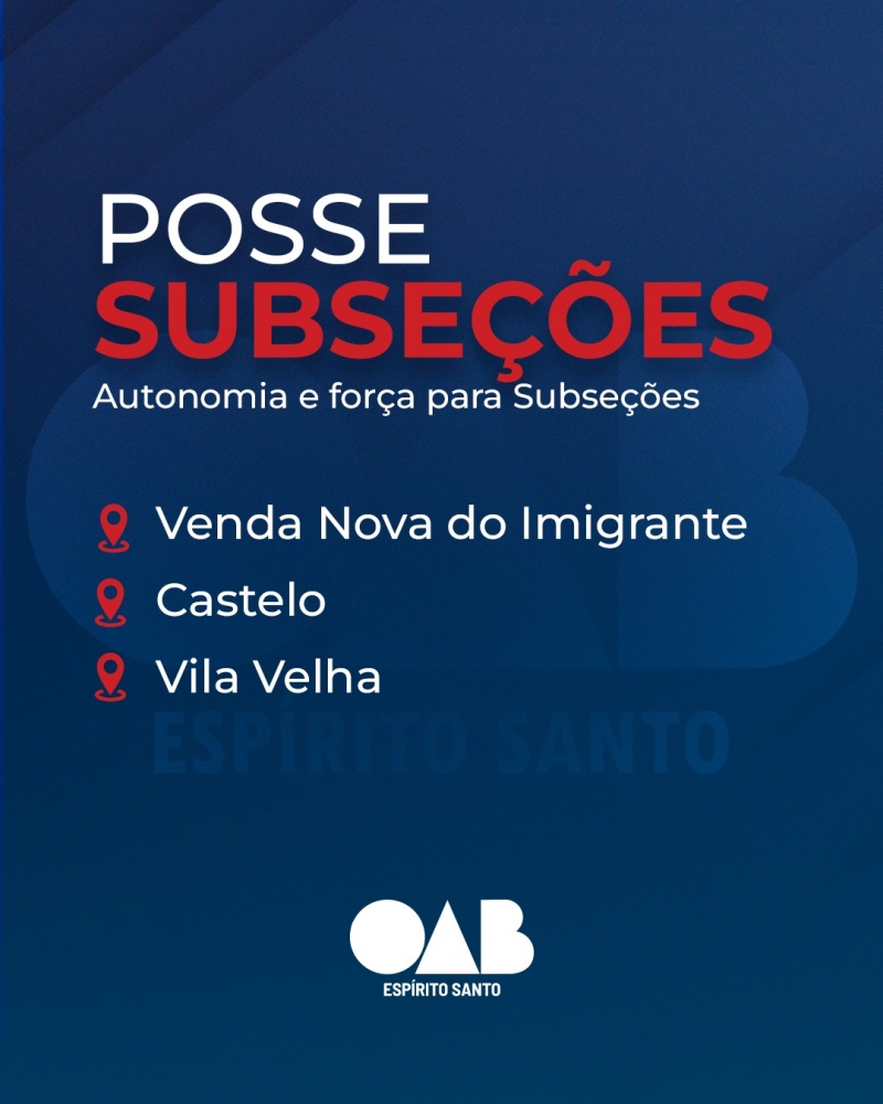 Ao participar de mais três posses das Subseções de Venda Nova do Imigrante, Castelo e Vila Velha, a presidente da OAB-ES, Érica Neves, frisou que a OAB é uma instituição que pertence à advocacia, e o compromisso de quem preside a Seccional é garantir que cada Subseção tenha autonomia e força para representar os advogados e advogadas de sua região.
