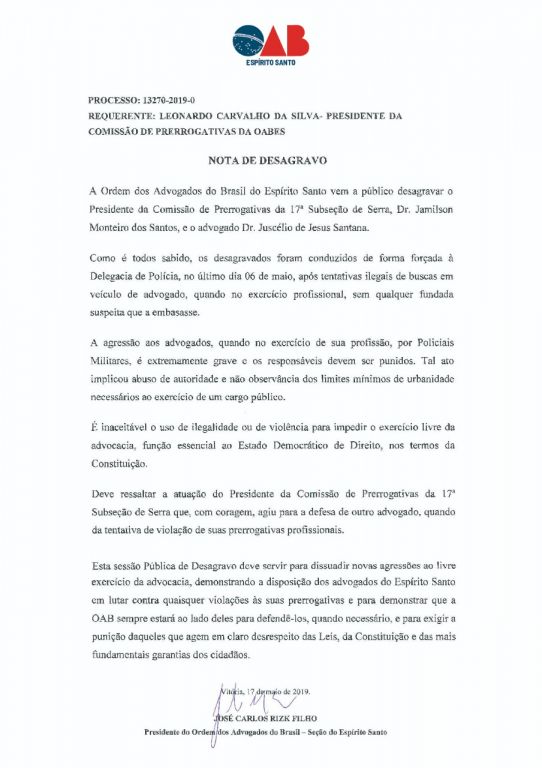O desagravo foi aprovado pelo Conselho Seccional da OAB-ES. Em nota (abaixo, a íntegra da nota), o presidente da OAB-ES, José Carlos Rizk Filho, informa que, "como é sabido, os desagravados foram de forma forçada à Delegacia de Polícia, no último dia 06 de maio, após tentativas ilegais de buscas em veículo de advogado, quando no exercício profissional, sem qualquer fundada suspeita que a embasasse."