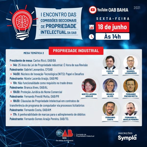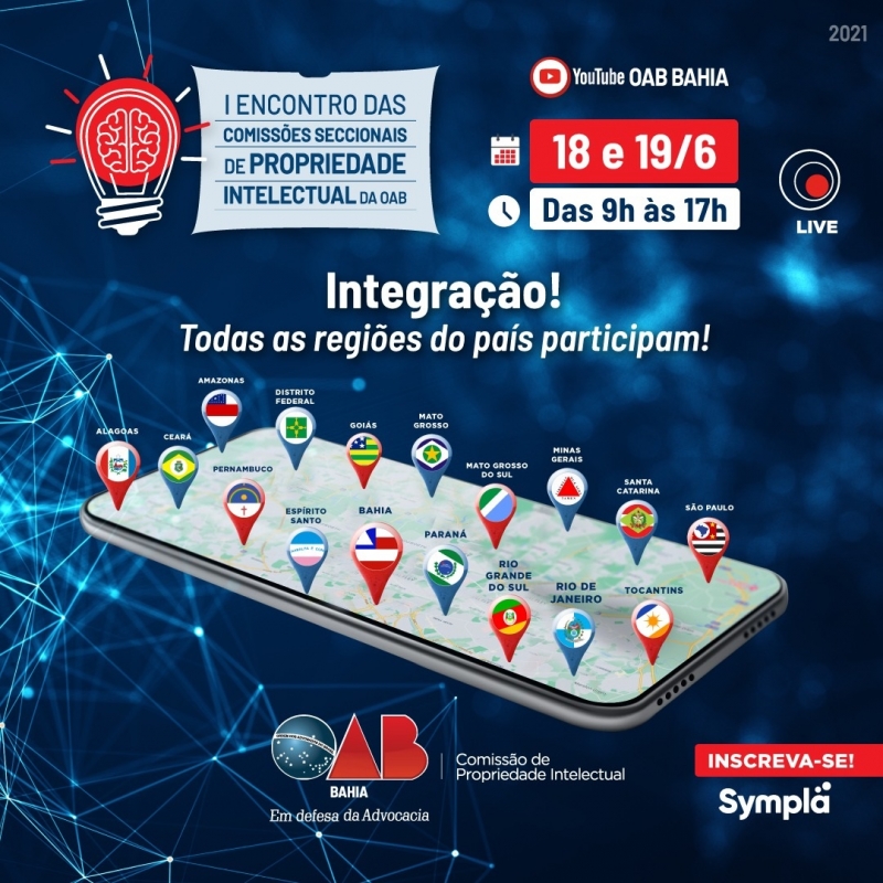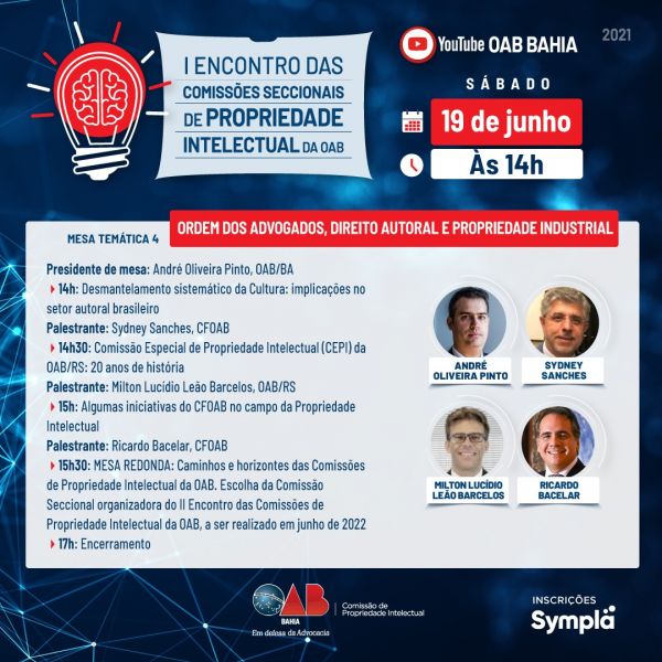 Nos próximos dias 18 e 19, das 9 às 17h, será realizado o I Encontro das Comissões Seccionais de Propriedade Intelectual da OAB. As inscrições são gratuitas e podem ser feitas pelo site do Sympla. O evento acontecerá pela plataforma Zoom e será transmitido ao vivo no canal da OAB-BA no YouTube. Serão fornecidos certificados de 16 horas-aula.