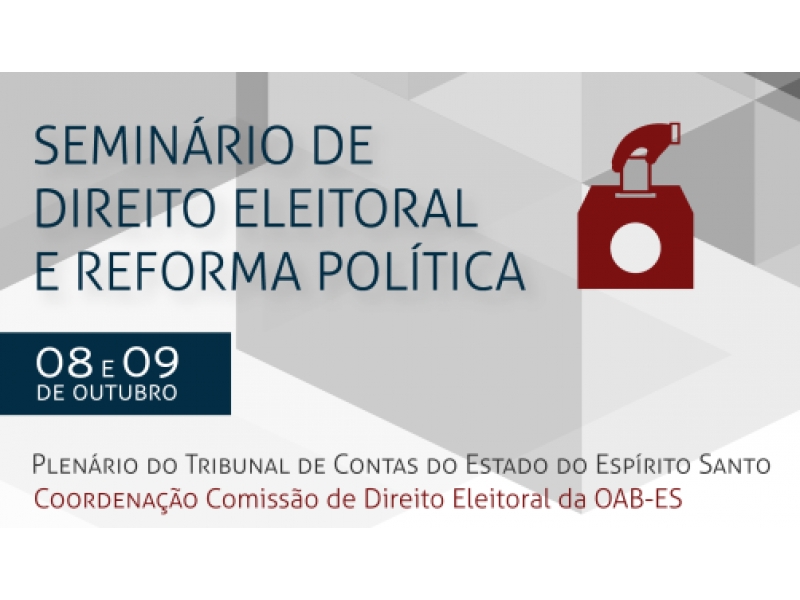 Já estão abertas as inscrições online para o Seminário de Direito Eleitoral e Reforma Política que será realizado nos dias 08 e 09 de outubro, com a coordenação da Comissão de Direito Eleitoral da OAB-ES em parceria com a Escola Superior de Advocaia da Ordem. O evento, programado para o Auditório do Tribunal de Contas do Estado, contará com sete palestras. O objetivo é promover um diálogo com todos os setores da sociedade civil, Ministério Público, Judiciário, polícia, associações civis e parlamentares. Os advogados em início de carreira têm desconto na INSCRIÇÃO ONLINE.