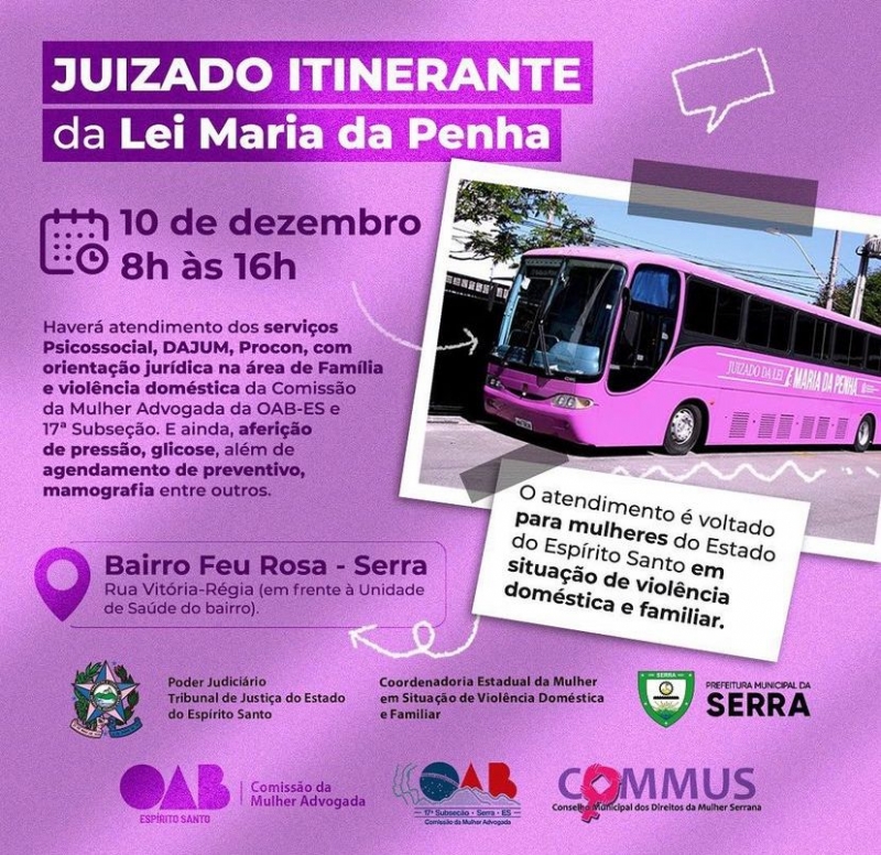 Ônibus itinerante da Lei Maria da Penha estará nesta sexta-feira (10/12) no município da Serra