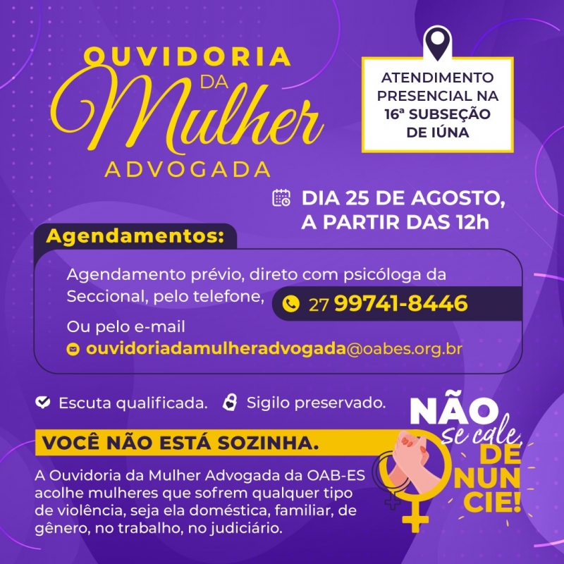 A Ouvidoria da Mulher Advogada da OAB-ES irá prestar atendimento presencial na 16ª Subseção de Iúna, na próxima quarta-feira (25/08), a partir das 12 horas.