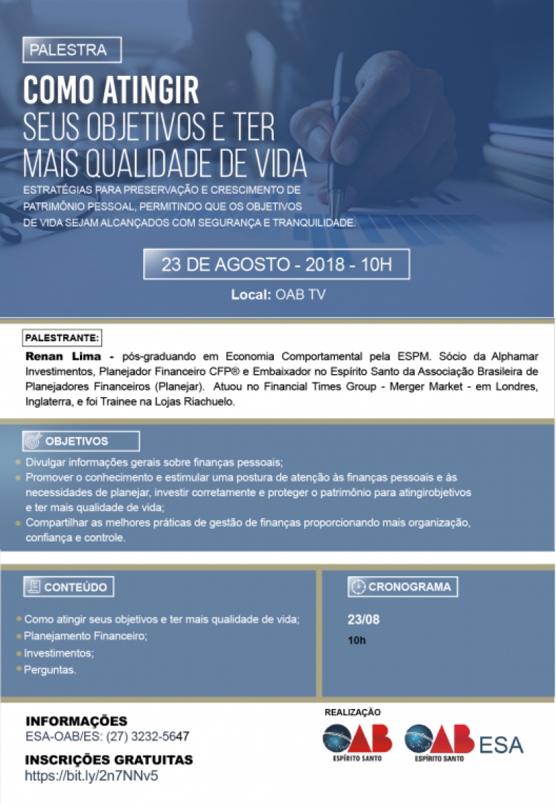 A Escola de Advocacia da Ordem dos Advogados do Brasil, Seção Espírito Santo (ESA-OAB/ES) recebe na próxima quinta-feira (23) o pós-graduando em Economia Comportamental, Renan Lima, para uma palestra, gratuita, na OAB TV intitulada “Como atingir os seus objetivos e ter mais qualidade de vida”.