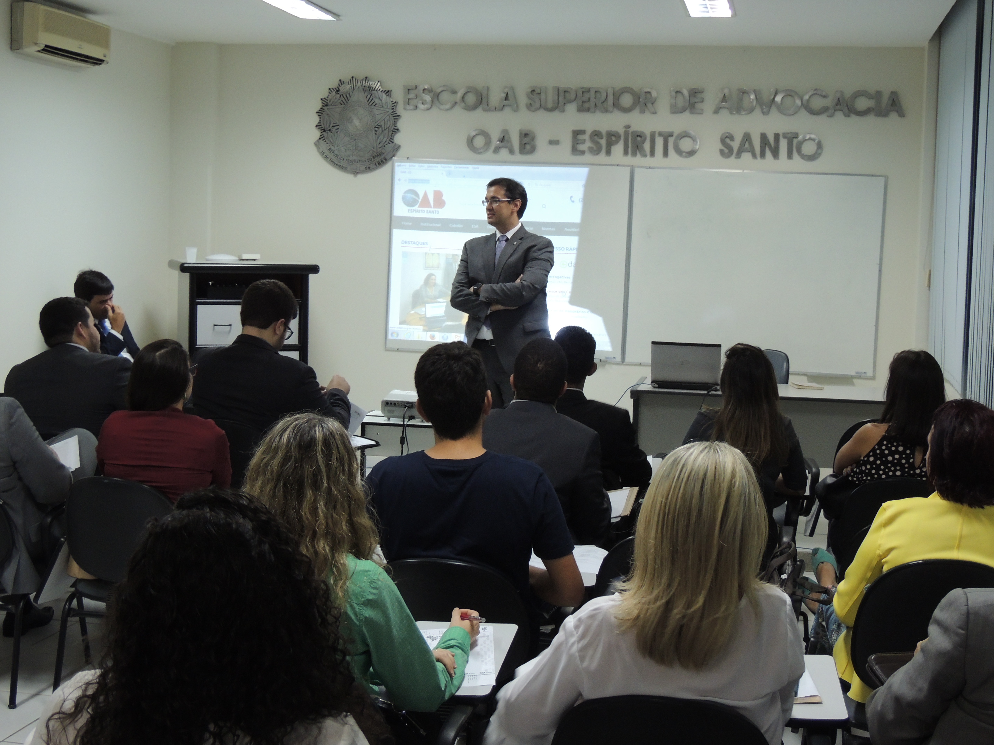 Iniciando a noite de estudos, que deu sequência aos trabalhos iniciados na terça (21) pelo advogado Leonardo Zehuri Tovar, o secretário-geral da Ordem, Ricardo Brum, fez uma apresentação prática mostrando aos participantes o caminho para chegar à criação da sociedade unipessoal. O palestrante explicou como é feito o procedimento pelo site da OAB-ES.