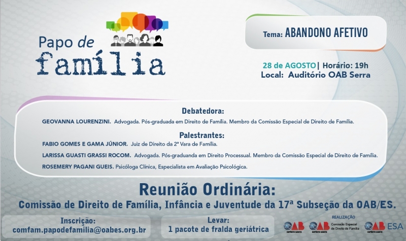 Nesta terça-feira (28), acontece mais uma edição do projeto Papo de Família. Desta vez, o debate será às 19 horas, no auditório da 17ª Subseção da Serra, com o tema “Abandono Afetivo”.