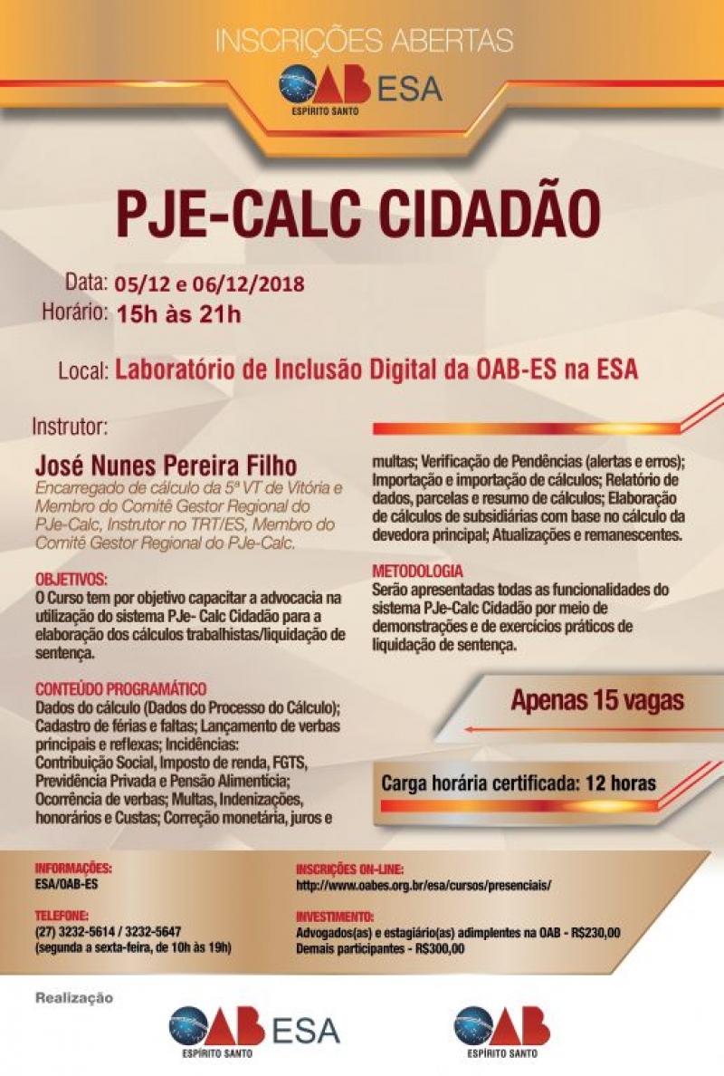 Estão abertas as inscrições para o curso PJe-CALC Cidadão, que será realizado no Laboratório de Inclusão Digital da Escola Superior de Advocacia da Ordem dos Advogados do Brasil - Seção Espírito Santo (ESA/OAB-ES), nos dias 05 e 06 de dezembro. O instrutor será José Nunes Pereira Filho, encarregado de cálculo na 5ª Vara do Trabalho de Vitória e membro do Comitê Gestor Regional do PJe-Calc do TRT-ES.