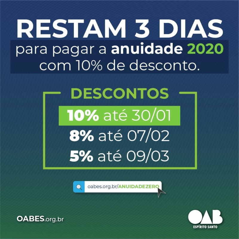 Os advogados e advogadas que quiserem efetuar o pagamento da cota única com desconto de 10% devem ficar atentos. O prazo de pagamento vai até a próxima quinta-feira (30/01). Os valores da anuidade 2020 não tiveram nenhum reajuste em relação aos de 2019.