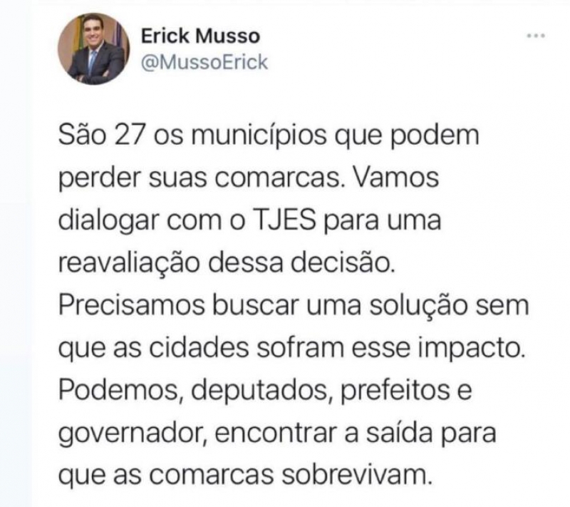 O presidente da Assembleia Legislativa do Espírito Santo (ALES), deputado Erick Musso, defende a não integração/extinção das 27 Comarcas no Espírito Santo. Manifestando seu posicionamento em suas redes sociais, Musso pediu o apoio dos demais representantes do poderes Legislativo e Executivo no sentido de dialogar com o Tribunal de Justiça do Espírito Santo (TJES) para uma reavaliação da questão.