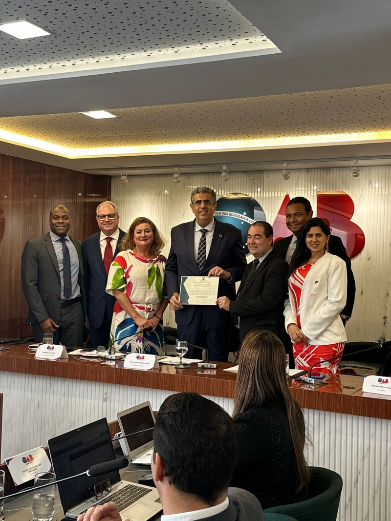 A homenagem foi entregue pelo procurador-geral, Renato Gasparini, e pelo procurador efetivo e presidente da Comissão de Direito Eleitoral da OAB-ES, Fernando Dilen, durante a sessão do Conselho Pleno da Ordem no Plenário, na sede da Seccional, em Vitória.
