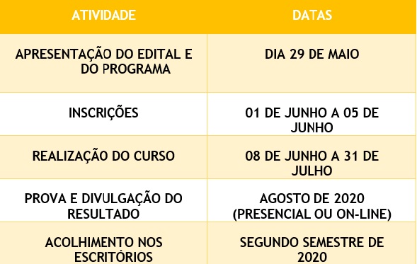 Após feito o curso, os participantes passarão por uma prova de seleção. Os 60 primeiros colocados participarão da imersão nos escritórios de advocacia que promoverão a experiência remunerada pelo período mínimo de 15 dias.