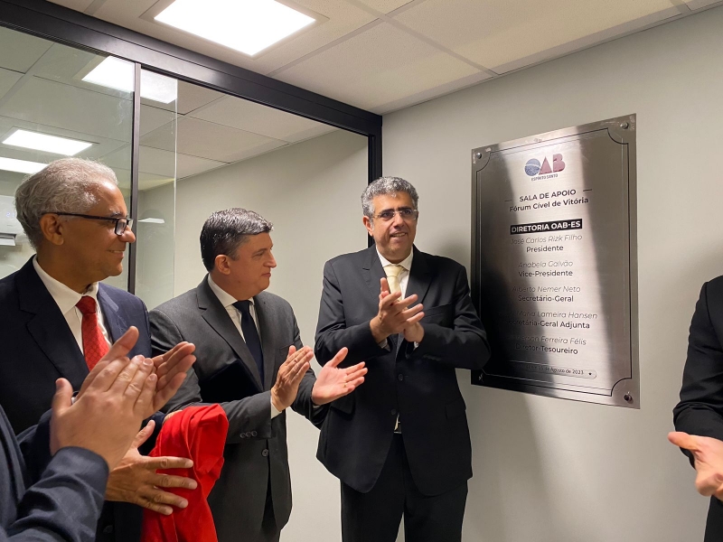 O presidente da Ordem dos Advogados do Brasil, Seccional Espírito Santo (OAB-ES), José Carlos Rizk Filho, ao lado do juiz Rodrigo Cardoso Freitas e do juiz Daniel Peçanha, inaugurou nesta terça-feira (15/08), a sala de apoio para advocacia no novo Fórum Cível de Vitória, situado na Enseada do Suá, na Capital.