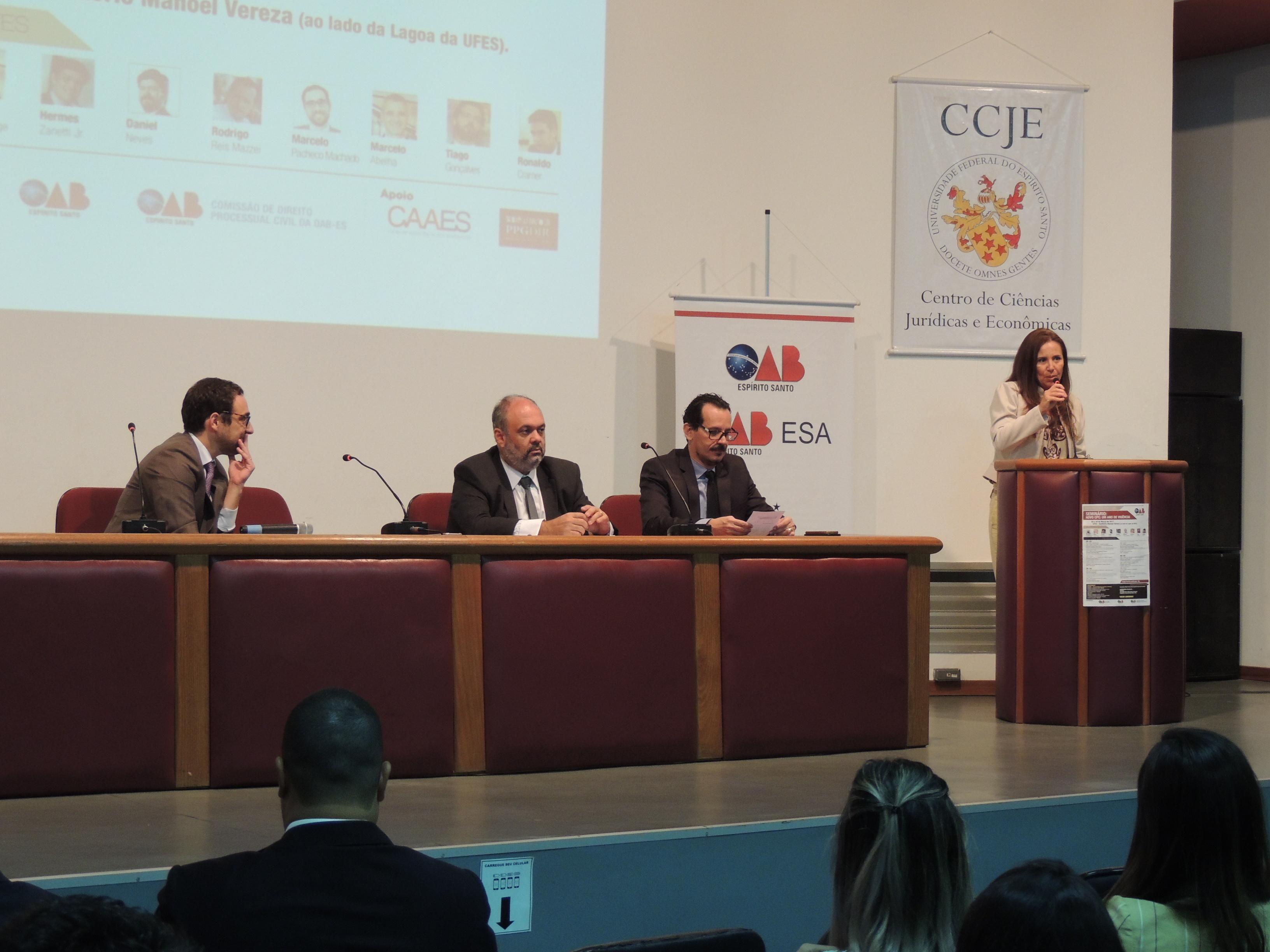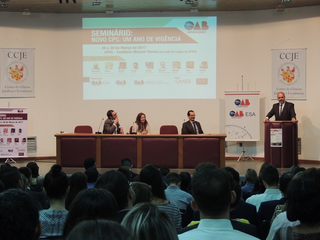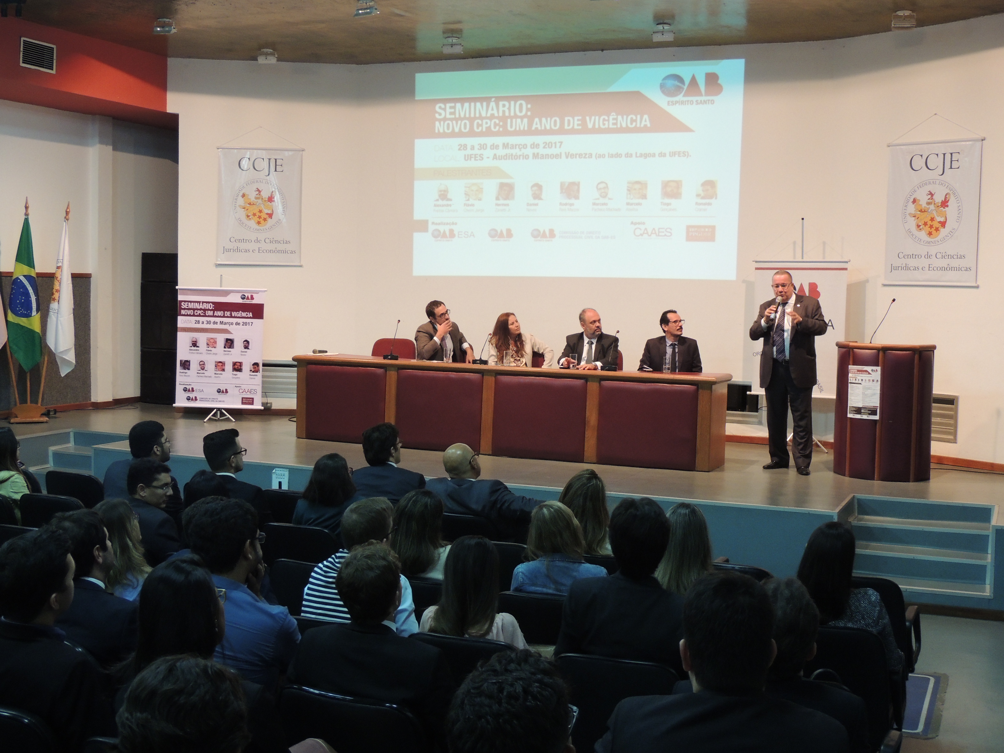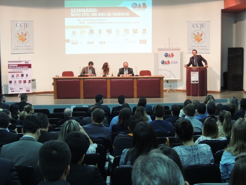 Com quase todos os lugares do auditório ocupados, teve início nessa terça-feira (28) o Seminário sobre um ano de vigência do novo CPC, no auditório Manoel Vereza, na Ufes. Mais uma vez a ESA e OAB-ES, por meio da Comissão de Direito Processual e com o apoio da CAAES, proporcionam aos advogados capixabas o estudo sobre o novo Código, reunindo especialistas do estado e de fora para exposições práticas.