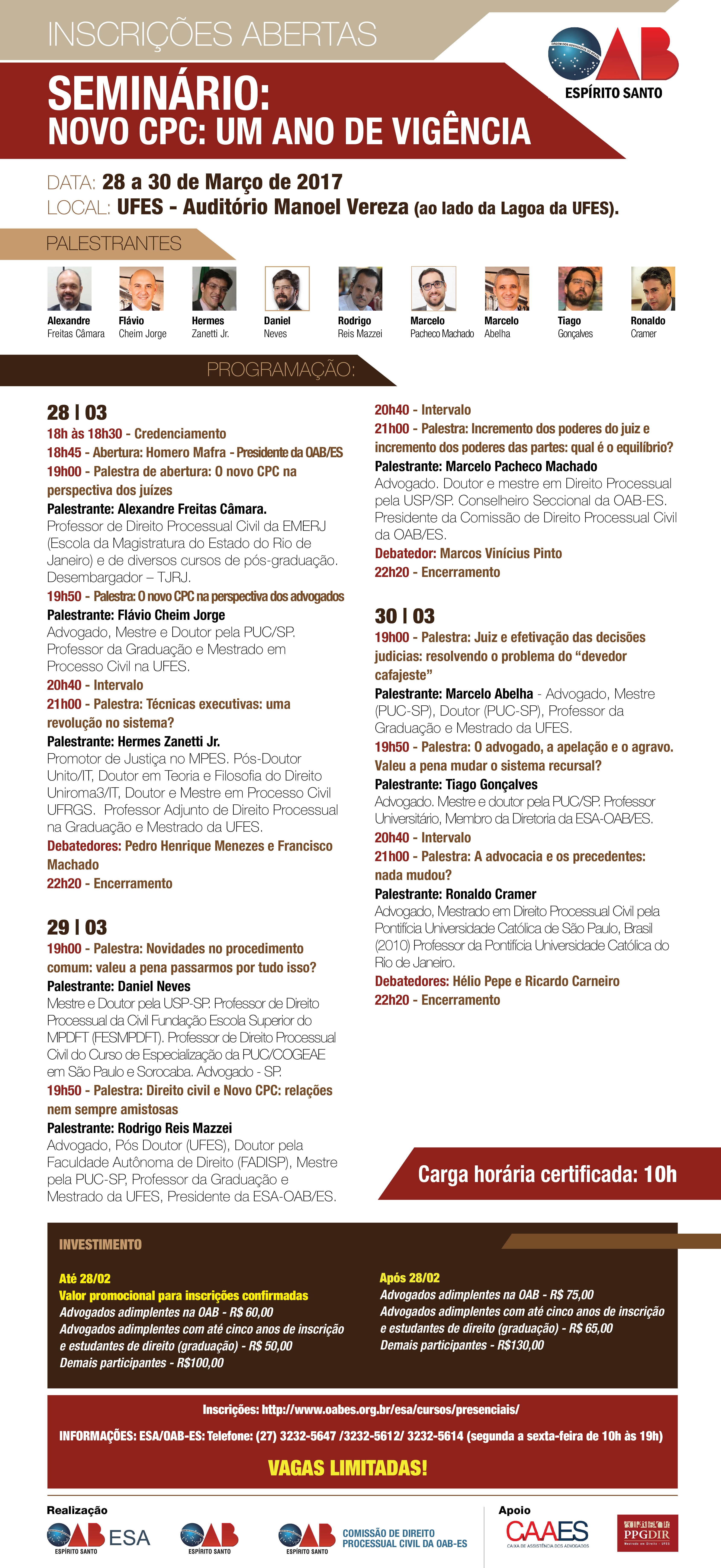 A vice-presidente da Seccional, Simone Silveira, que compôs a mesa durante o Seminário, também fez uma breve fala e disse que o evento atende a uma demanda da advocacia. “Os advogados têm nos solicitado que possamos oferecer encontros com debates ligados a nossa vida prática do que propriamente ensinamentos doutrinários, que estamos acostumados a ouvir na faculdade e cursos de especialização. Queremos levar à advocacia uma noção do que esperamos do novo CPC, o que conseguimos conquistar e o que ele trouxe de reais vantagens e desvantagens. Para atender a essa demanda da advocacia a OAB-ES e a ESA se esforçam todos os dias, trabalhando na organização de palestras, cursos e Seminários acessíveis a todos.”