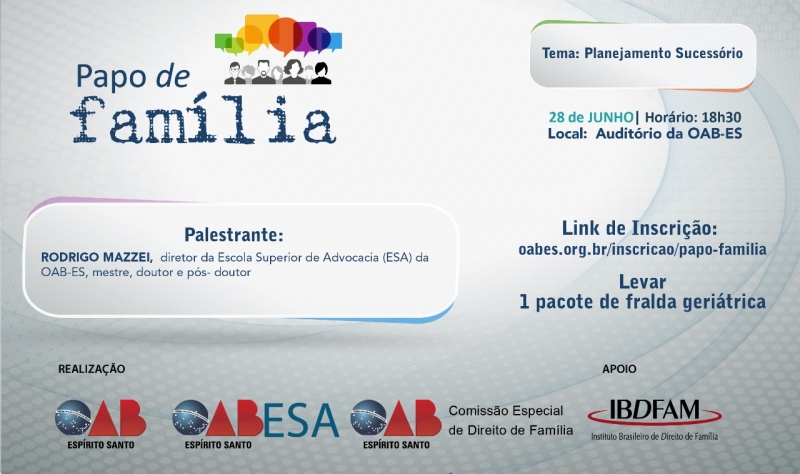 Vale lembrar que este será o último Papo de Família realizado na Seccional. Depois, o projeto vai percorrer as subseções de Cariacica, Serra, Colatina e Vila Velha, sendo alguns desses eventos em conjunto com o projeto Famílias em Foco, ou seja, serão realizados para operadores e estudantes de Direito.