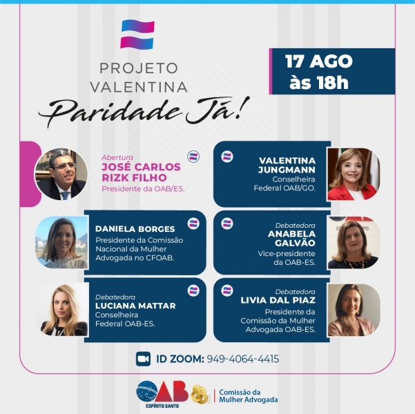 As advogadas e os advogados capixabas terão oportunidade de participar de um debate sobre a paridade de gêneros para cargos no Sistema da Ordem dos Advogados do Brasil (OAB) na noite de segunda-feira (17/08). Trata-se do Projeto Valentina do Conselho Federal.