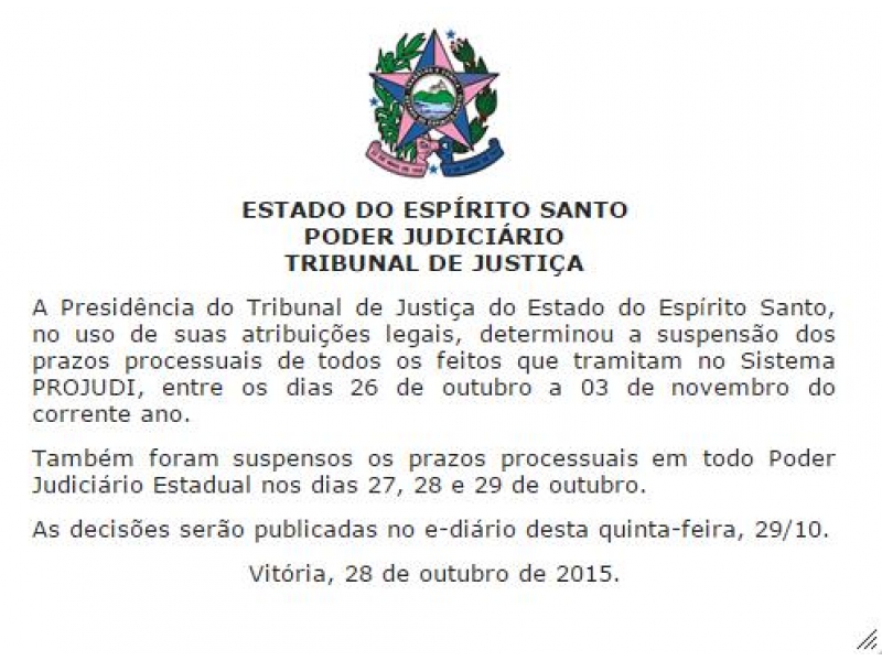 PROJUDI: TJES suspende prazos de 26 de outubro a 03 de novembro