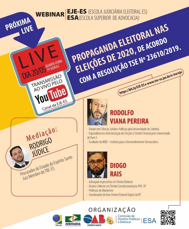 “Propaganda Eleitoral nas Eleições de 2020) é o quinto Webinar promovido pela Escola Judiciária Eleitoral do TRE-ES, em parceria com a Comissão de Direitos Políticos e Eleitoral da OAB-ES e a Escola Superior de Advocacia (ESA/ES), e faz parte da série de palestras, conferências e debates com foco nas Eleições de 2020.