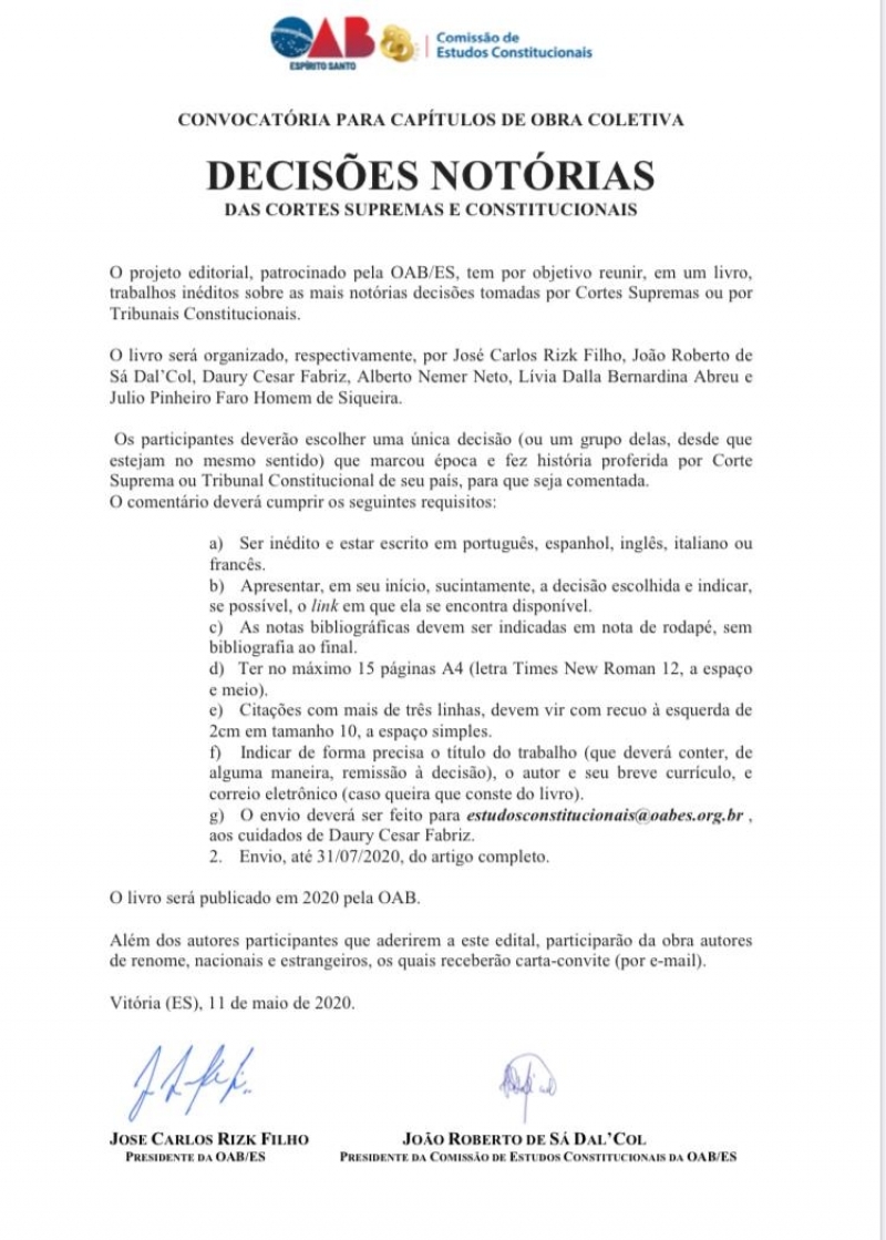 O livro será publicado em 2020 pela OAB-ES. O comentário deverá cumprir os seguintes requisitos: ser inédito e estar escrito em português, espanhol, inglês, italiano ou francês; apresentar, em seu início, sucintamente, a decisão escolhida e indicar, se possível, o link em que ela se encontra disponível; as notas bibliográficas devem ser indicadas em nota de rodapé, sem bibliografia ao final; ter no máximo 15 páginas A4 (letra Times New Roman 12, a espaço e meio); as citações com mais de três linhas, devem vir com recuo à esquerda de 2 cm em tamanho 10, a espaço simples; indicar de forma precisa o título do trabalho (que deverá conter, de alguma maneira, remissão à decisão); o autor e seu breve currículo, e correio eletrônico (caso queira que conste do livro).