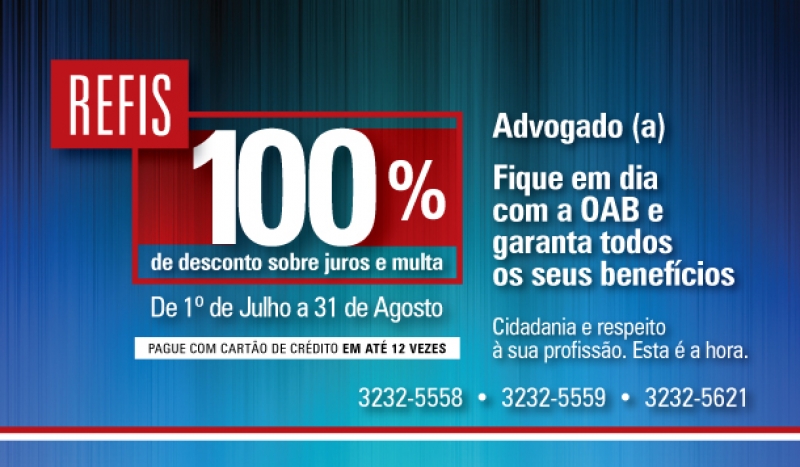 Os advogados capixabas já podem aderir ao programa de recuperação de anuidades da OAB-ES, o “REFIS OAB-ES”, que oferece a oportunidade para que os advogados regularizem suas pendencias financeiras em condições especiais. É concedido o desconto de 100% sobre juros e multa para o pagamento das anuidades anteriores a 2016, incluindo aquelas que se encontram em execução judicial. O desconto é válido tanto para o pagamento à vista em boleto bancário, quanto para parcelamento em até doze vezes no cartão de crédito. Os advogados poderão aderir ao Refis OAB-ES até o dia 31 DE AGOSTO. Entre em contato pelos telefones 3232-5558, 3232-5559 ou 3232-5621.