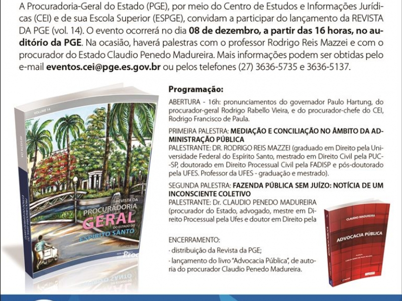 Os interessados podem obter mais informações pelo e-mail eventos.cei@pge.es.gov.br ou pelos telefones 3636-5735 ou 3636-5137.
