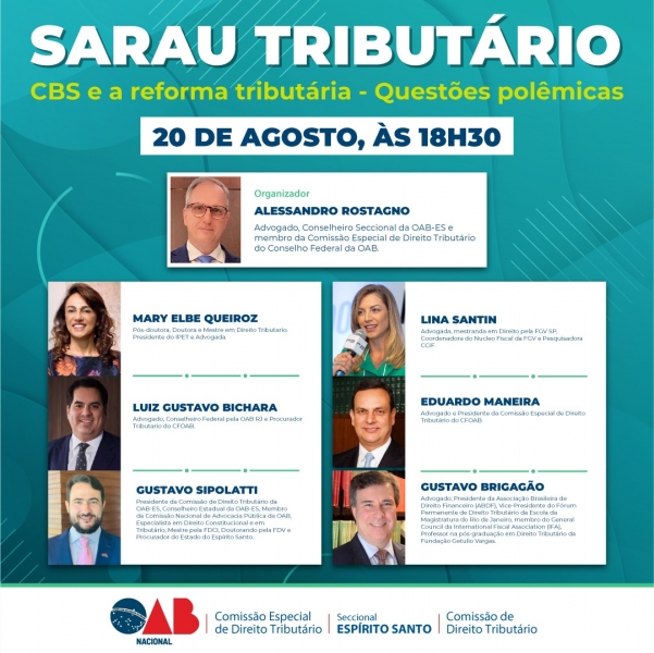 A Comissão de Direito Tributário da OAB Espírito Santo, em parceria com a Comissão Especial de Direito Tributário do Conselho Federal da OAB, recebe no Sarau Tributário desta quinta-feira (20/08) às 18h30, renomados tributaristas para importante debate sobre a primeira proposta do Governo Federal de reforma tributária (criação da CBS - contribuição de bens e serviços - PL 3887/2020), suas peculiariedades, dispositivos e questões polêmicas derivadas.