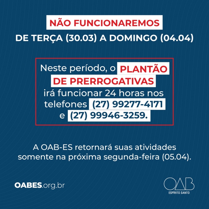 Neste período, somente o Plantão de Prerrogativas irá funcionar 24 horas nos telefones (27) 99277-4171 e (27) 99946-3259.