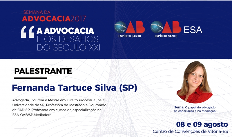 “A ampliação do uso de meios consensuais abre uma valiosa frente de trabalho que gera maiores e melhores chances de atender aos interesses do cliente com eficiência”, declara a palestrante Fernanda Tartuce Silva, que vai apresentar o tema “O papel do advogado na conciliação e na mediação” na Semana da Advocacia 2017, no Centro de Convenções de Vitória, que acontece nos próximos dias 08 e 09. FAÇA SUA INSCRIÇÃO