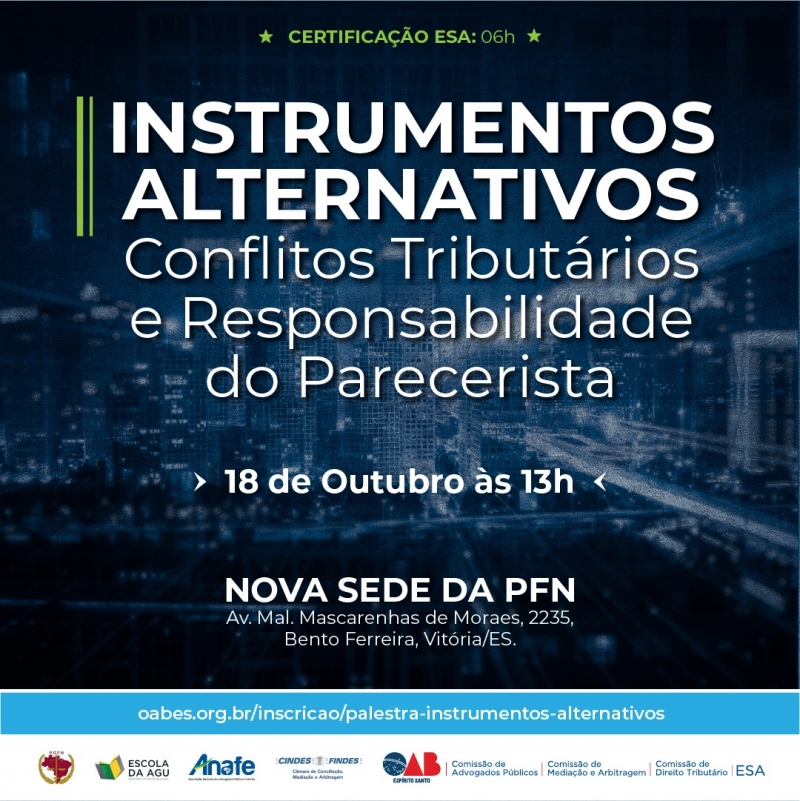 Profissionais da advocacia municipal, federal e privada estarão reunidos para debater as alternativas para solução de conflitos tributários e a responsabilidade do parecerista na tarde da próxima sexta-feira, 18 de outubro, às 13h, na nova da sede da Procuradoria da Fazenda Nacional, em Vitoria .