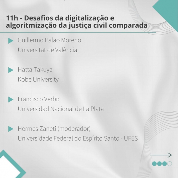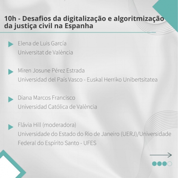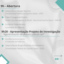 O evento será on-line, com abertura às 9h, e possui os seguintes painéis: Apresentação Projeto de Investigação "Algoritmización del proceso judicial civil", às 9h20. Desafios da digitalização e algoritmização da justiça civil na Espanha, às 10h, e Desafios da digitalização e algoritmização da justiça civil comparada às 11h.