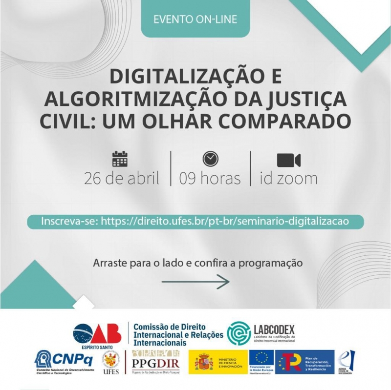 Na quarta-feira (26), a partir das 9h, acontecerá o Seminário Internacional "Digitalização e algoritmização da justiça civil: um olhar comparado. O evento é uma parceria entre o Programa de Pós-Graduação em Direito da Universidade Federal do Espírito Santo (UFES), Programa de Pós-Graduação em Direito da UFES (PPGDIR/UFES) e a Universitat de València, com o Grupo de Pesquisa Labirinto da Codificação do Direito Processual Internacional (LABCODEX). Além disso, conta com o apoio da Comissão de Direito Internacional da OAB-ES.