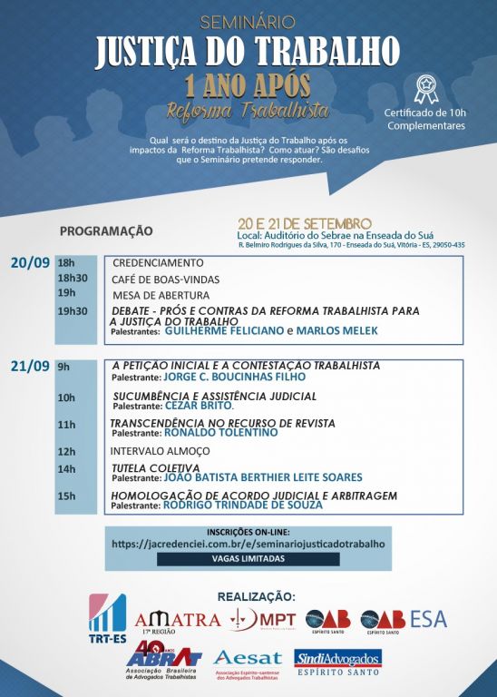 Na avaliação do palestrante, o Seminário será extremamente interessante, porque reunirá nomes da magistratura, advocacia e Ministério Público. “Teremos opiniões dos três sujeitos que compõem a Justiça do Trabalho”, completou.