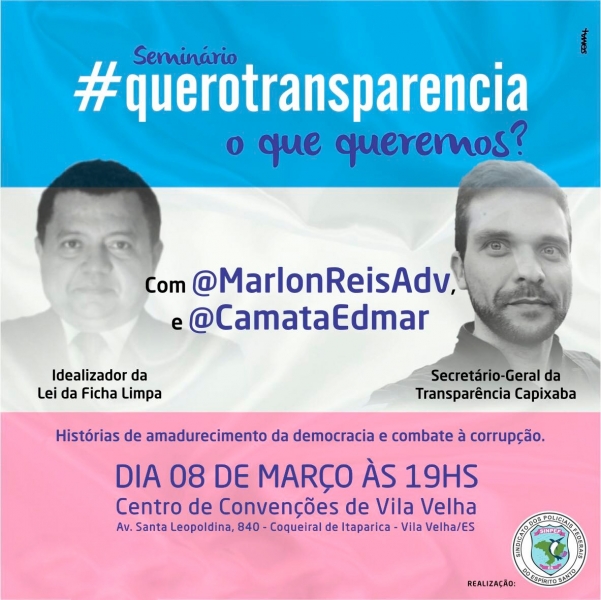 O Sindicado dos Policiais Federais do Espírito Santo (Sinpef-ES) realiza nesta quinta-feira (8), o seminário “O que queremos? #querotransparência”. O evento acontece às 19h, no Centro de Convenções Vila Velha, tendo como palestrantes o idealizador da Lei da Ficha Limpa, o advogado Marlon Reis, e o secretário-geral da ONG Transparência Capixaba, o policial rodoviário federal Edmar Camata.