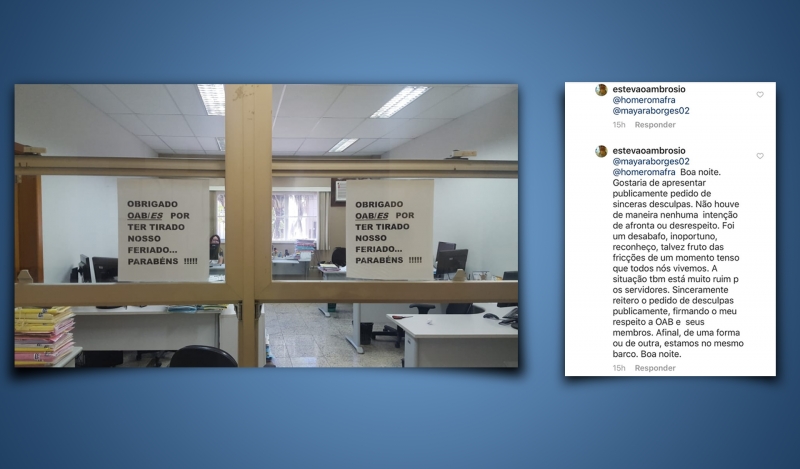 Em comentário feito no Instagram pessoal do presidente da Ordem dos Advogados do Brasil – Seção Espírito Santo (OAB-ES), Homero Mafra, o servidor disse: “Boa noite. Gostaria de apresentar publicamente pedido de sinceras desculpas. Não houve de maneira nenhuma intenção de afronta ou desrespeito. Foi um desabafo, inoportuno, reconheço, talvez fruto das fricções de um momento tenso que todos nós vivemos. A situação também está muito ruim para os servidores. Sinceramente reitero o pedido de desculpas publicamente, firmando o meu respeito à OAB e a seus membros. Afinal, de uma forma ou de outra, estamos no mesmo barco. Boa noite”.